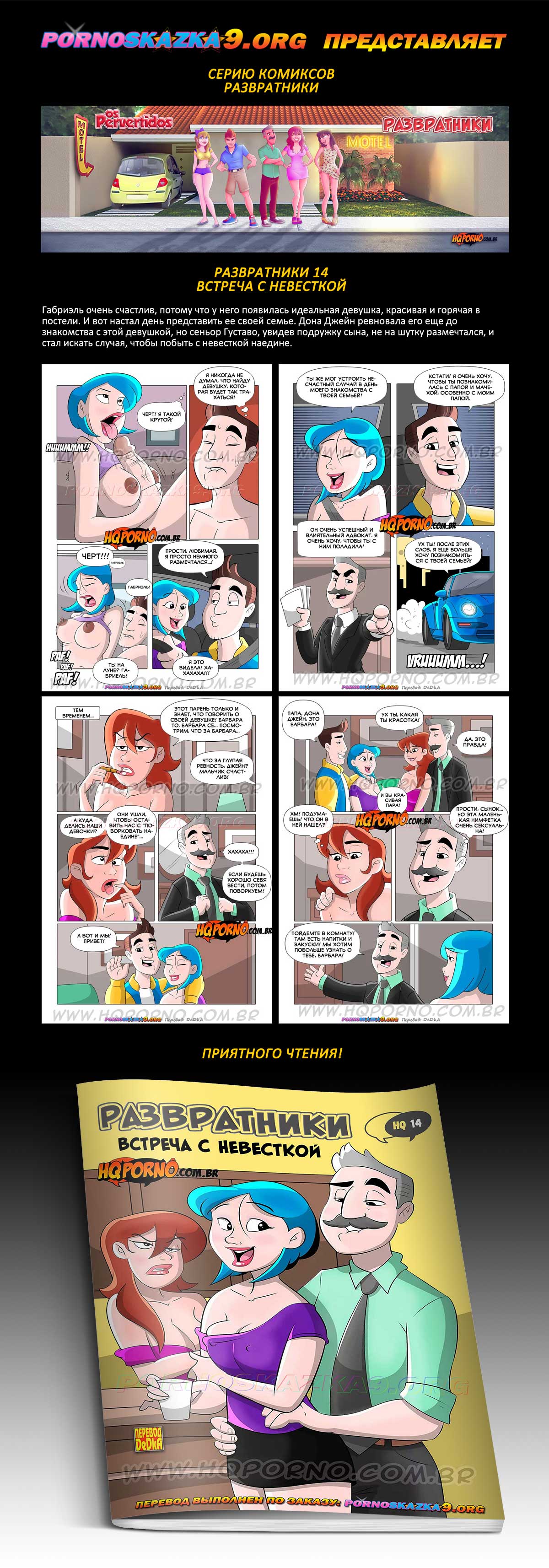 Порно комикс Развратники. Часть 14: Встреча с невесткой. Габриэль очень счастлив, потому что у него появилась идеальная девушка, красивая и горячая в постели. И вот настал день представить ее своей семье. Дона Джейн ревновала его еще до знакомства с этой девушкой, но сеньор Густаво, увидев подружку сына, не на шутку размечтался, и стал искать случая, чтобы побыть с невесткой наедине.